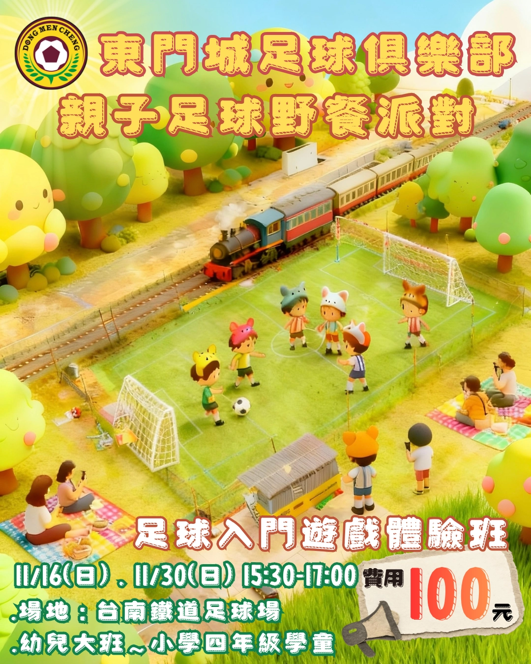 親子足球野餐派對草地上踢球+野餐+放心玩耍的週末午後!東門城足球俱樂部邀請您和孩子,一起到草地上奔跑、踢球、放心玩耍!這不是補習課,而是一個讓孩子從玩中學、家長放鬆陪伴的幸福活動時光。🟩 【活動亮點】✅ 足球闖關遊戲,適合零基礎孩子✅ 家長可攜野餐墊,在草地邊輕鬆觀賽✅ 親民價格每位孩童 100 元即可參加這是一個「孩子放電 × 家長充電」的週末親子活動。🟩 【活動資訊】📍 地點|台南鐵道足球場📅 日期|11/16(日)、11/30(日)※ 可複選⏰ 時間|15:30–17:00(實際課程 1 小時)🎯 對象|幼兒園大班~小學四年級💰 費用|每位學童 100 元(現場繳費)🧺 攜帶物品|運動鞋、水壺、野餐墊(家長可現場鋪野餐墊觀看)🟩 【現場氛圍】這不是補習班,而是一個一起創造回憶的下午。孩子:跑跳、射門、闖關、交朋友家長:野餐、拍照、聊天、享受微風草地+陽光+歡笑,就是最好的週末節奏 🌞🟩 【活動流程表】時間活動內容15:20報到15:30足球闖關體驗、活動小型比賽、團體遊戲16:30足球活動結束(可自由停留親子運動互動)🟩 【報名方式】✔ 可一次報名多位孩子✔ 可勾選多個活動場次✔ 名額有限,額滿即止🟩 【注意事項】• 若遇天候不佳,可能延期或取消,將以簡訊或 LINE 通知• 活動過程將拍照記錄,並用於社群/宣傳頁面• 若報名後需取消,請事先告知避免名額浪費• 現場備有基本廁所與飲水區