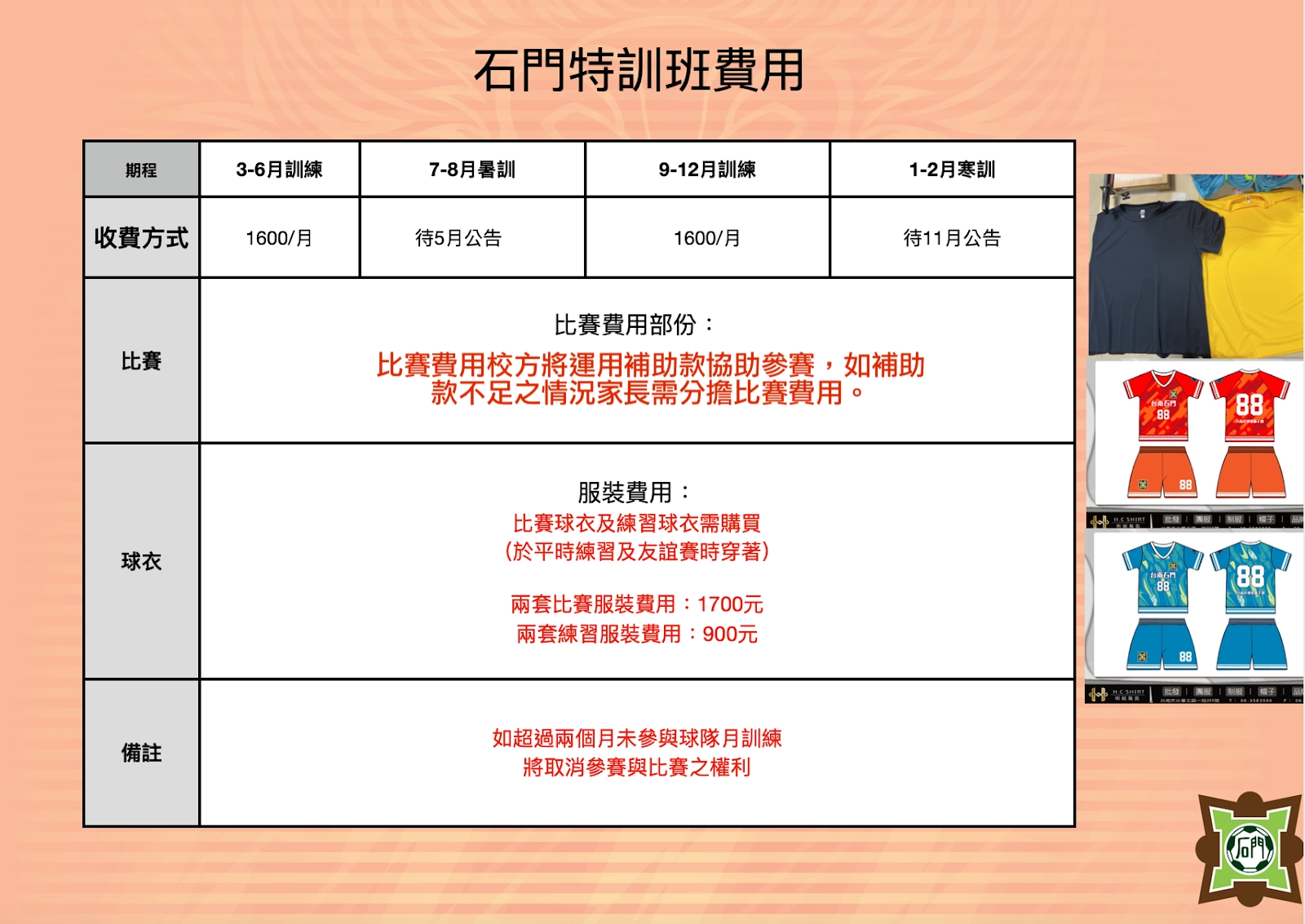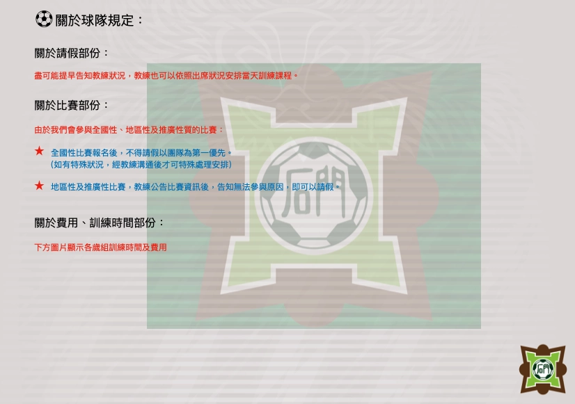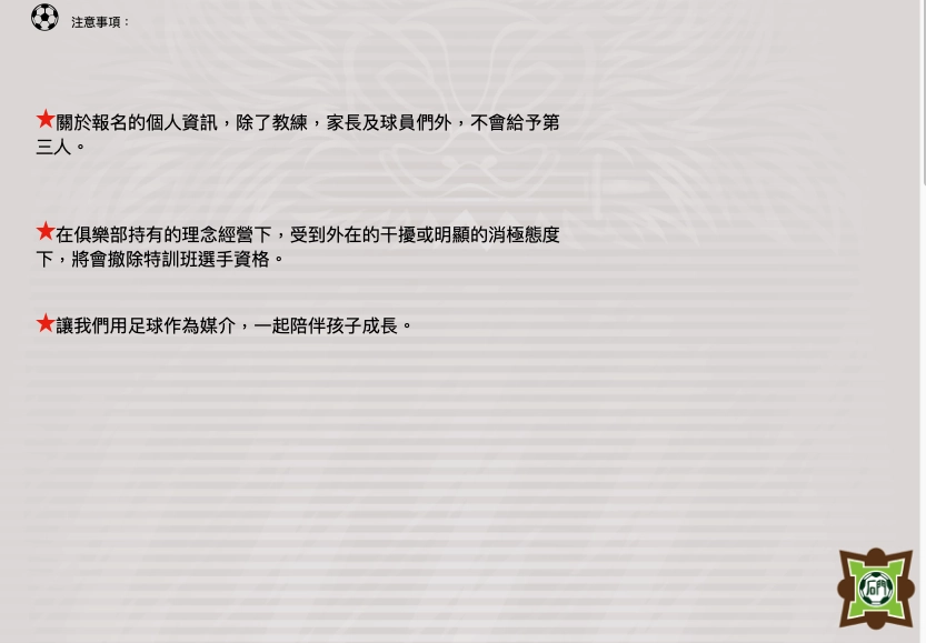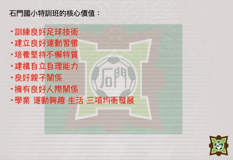 打造足球團隊大家庭,於國小階段透過足球陪伴孩子學習,期待孩子於特訓班所學,幫助未來求學與生活之所優勢需條件。