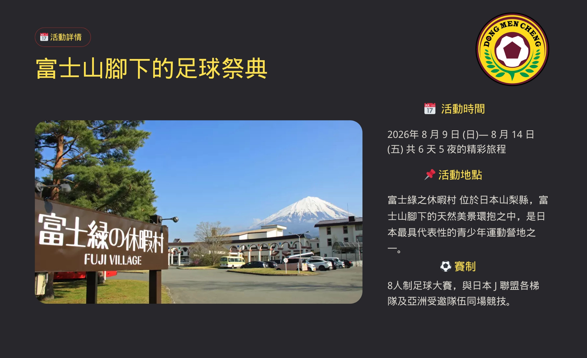 遠征基地座落於「富士綠之休暇村」。在清新的山嵐與壯麗的富士山景觀下,提供選手最優質的天然草皮場地,讓每一次傳球與射門都成為珍貴的記憶。