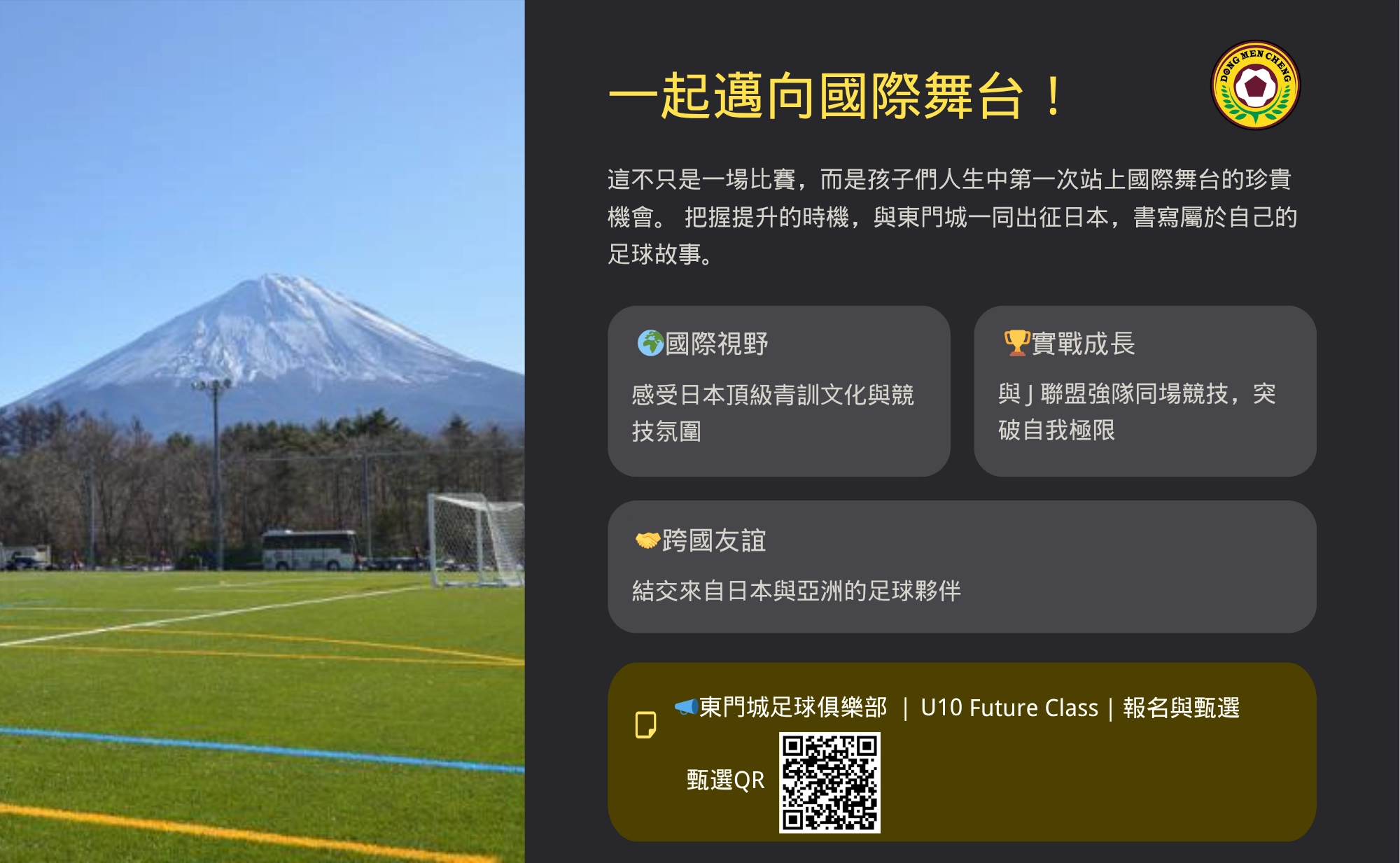跨出這一步,就是邁向國際舞台的開始。與東門城一起寫下屬於你們的足球故事!