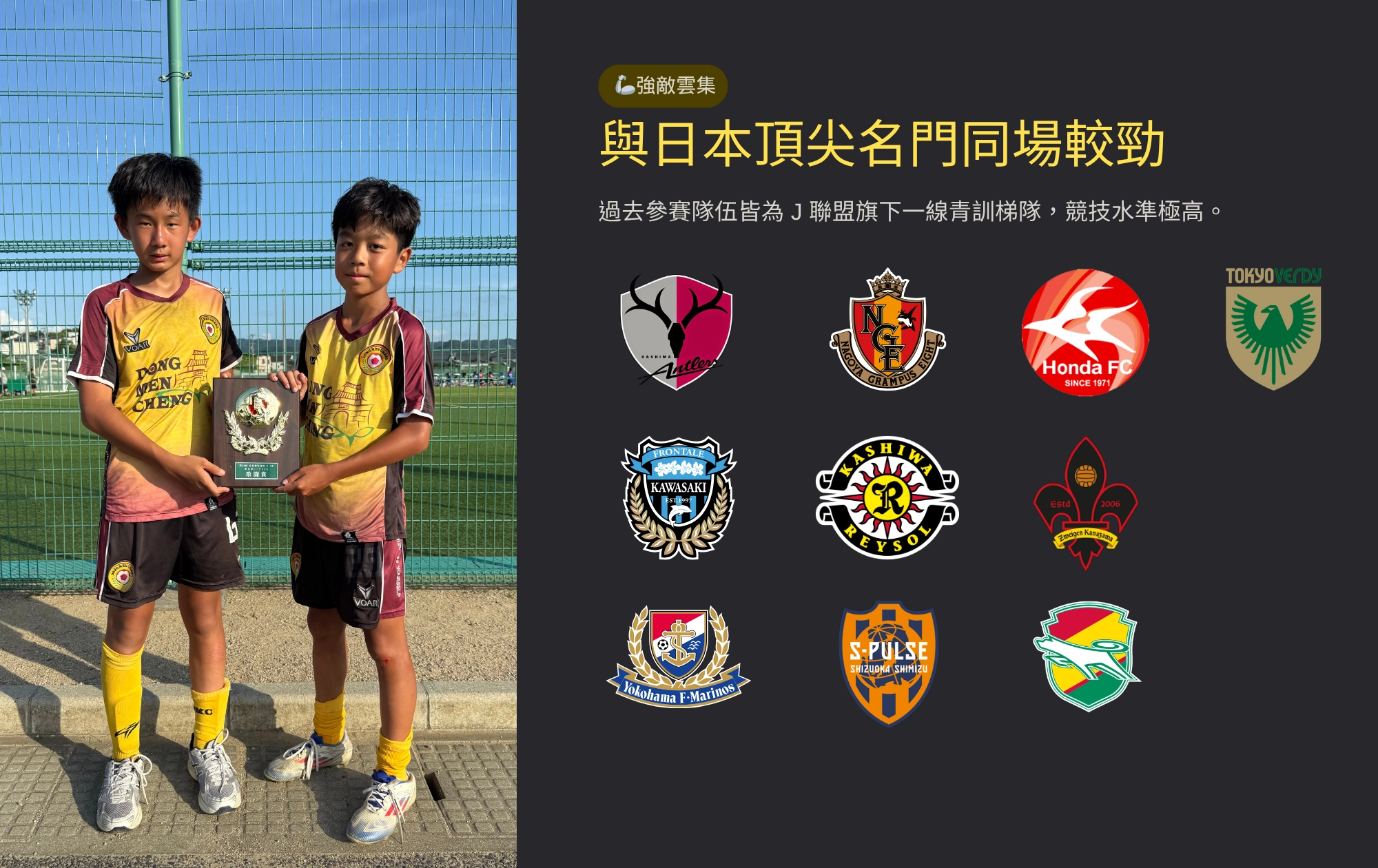 過去參賽隊伍包含鹿島鹿角、川崎前鋒、橫濱水手、東京綠茵等職足梯隊 。在世界級的對抗中發掘潛能,讓孩子看到足球更多的可能性。