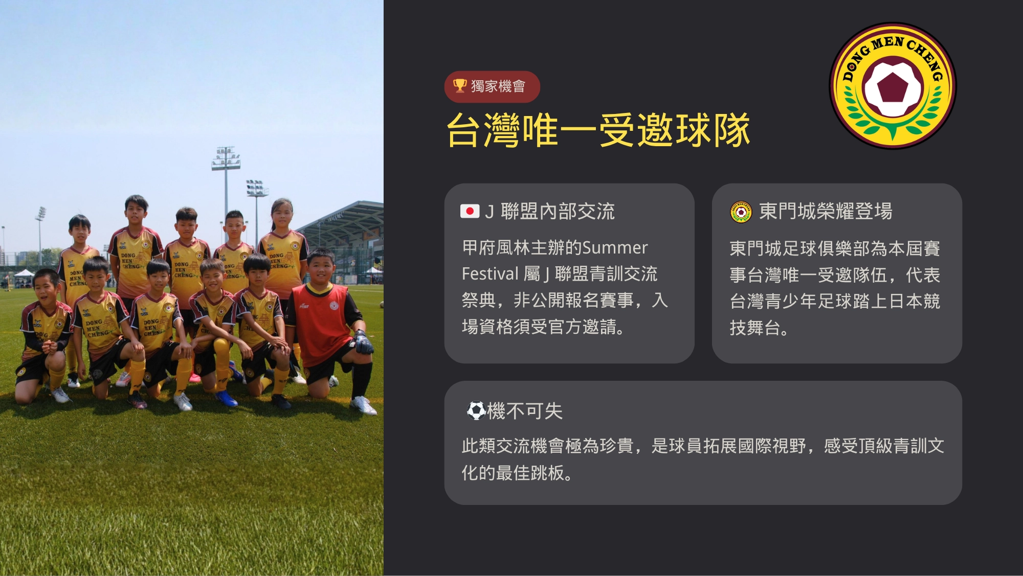 這是東門城為台灣孩子爭取到的唯一門票。在富士山腳下,與日本頂尖職業青訓正面對決,開啟邁向國際舞台的足球故事。