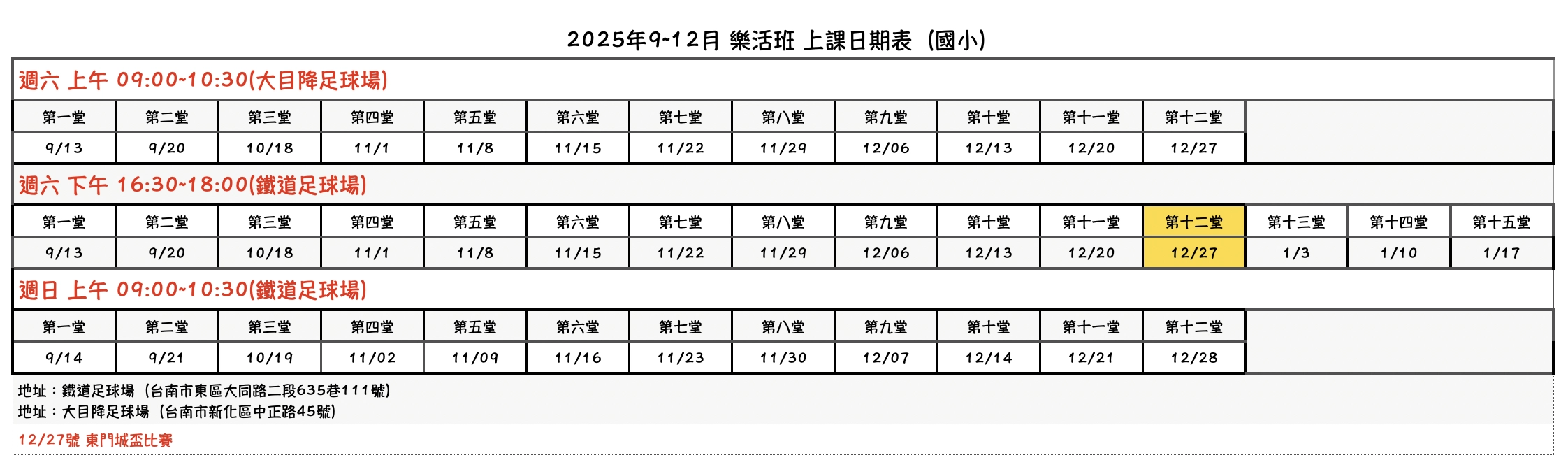 - 如遇請假,也可於 12 堂課程排程內,跨地點/時段補課。